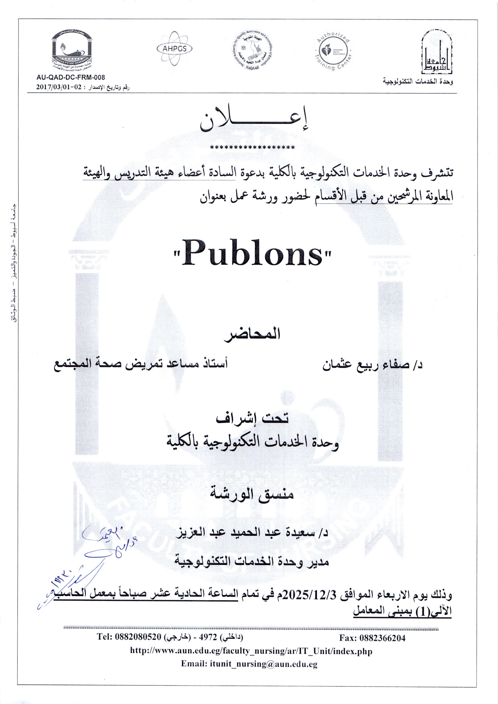 Announcement of a workshop for faculty members and support staff nominated to attend the workshop "publons" 1 December 2025