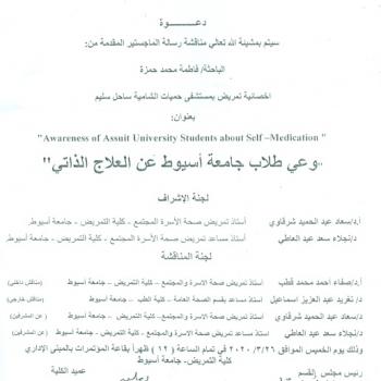 By God willing, master thesis submitted by researcher/ Fatma Mohamed Hamza, nursing specialist, will be discussed on Thursday, 26/3/2020, at 12:00 noon, at the conference hall of the college.