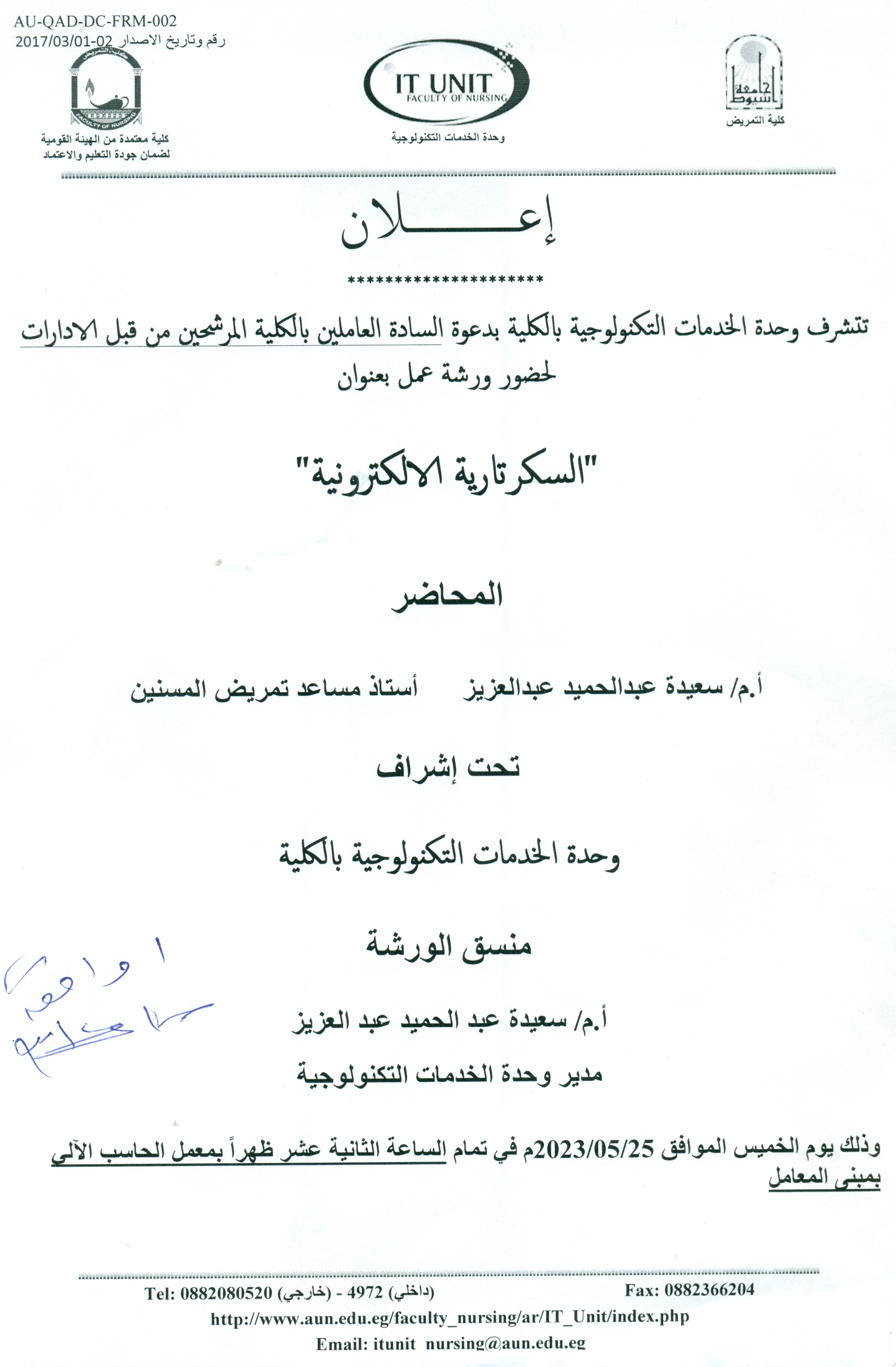 - Announcement *** The Technology Services Unit of the faculty is honored to invite the staff of the faculty nominated by the departments to attend a workshop entitled "Electronic Secretarial"