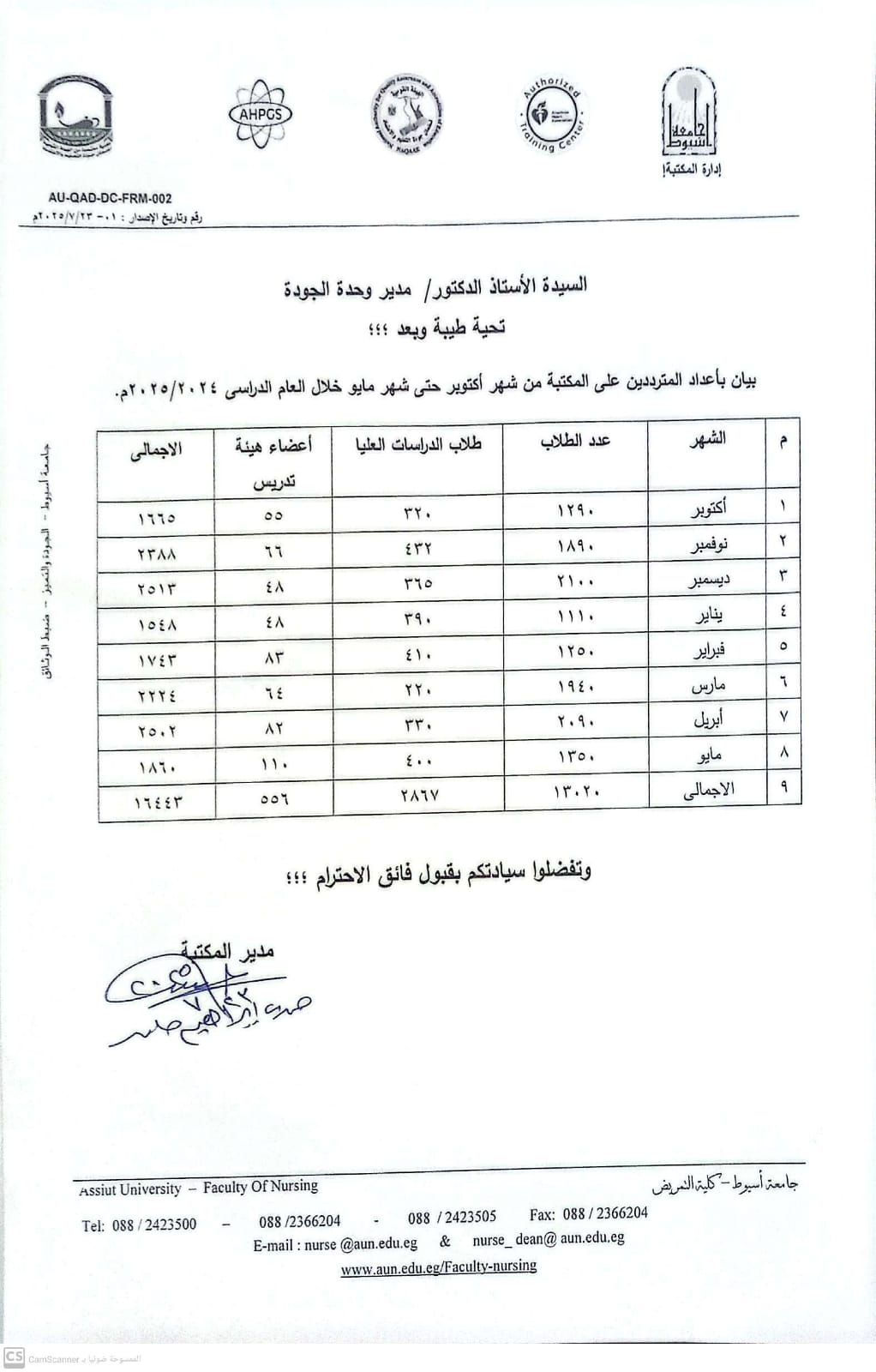 تاسعاً : تطوير مكتبة الكلية وتزويدها بنقاط اتصال بشبكة المعلومات وكذلك بأحدث الإصدارات من المراجع في مجال التمريض .