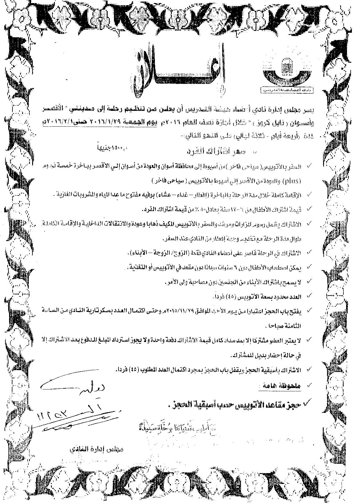 إدارة نادي أعضاء هيئة التدريس تنظم رحلة إلى مدينتي "الأقصر وأسوان" خلال أجازة نصف العام 23 نوفمبر 2015 إدارة نادي أعضاء هيئة التدريس تنظم رحلة إلى مدينتي "الأقصر وأسوان" خلال أجازة نصف العام