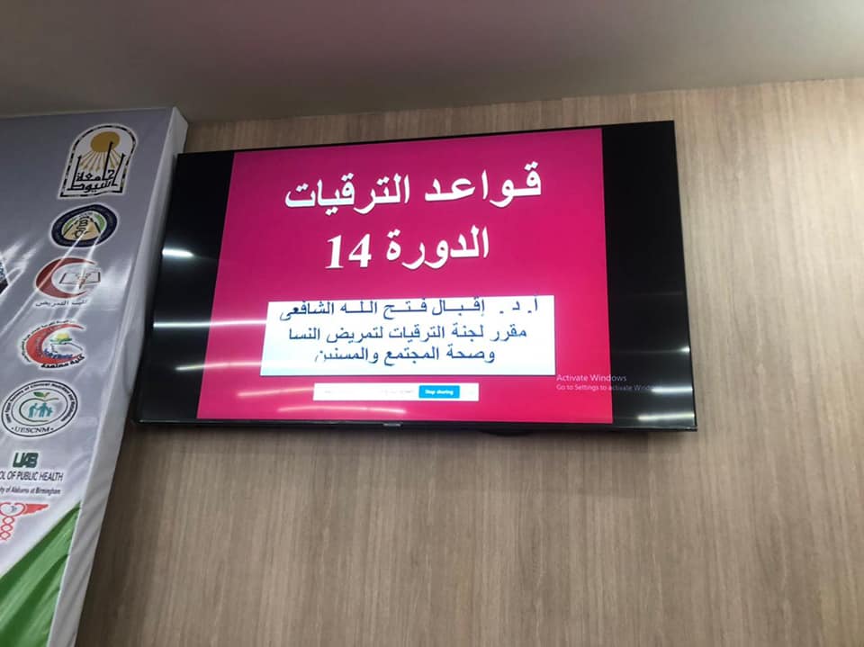 احدى جلسات المؤتمر الدولى الخامس لكلية التمريض جامعة اسيوط والثالث لكليات التمريض بصعيد مصر ومحاضرة عن قواعد الترقيات الدورة ١٤ وتحاضر بها السيد الأستاذ الدكتور إقبال فتح الله الشافعى مقرر لجنة الترقيات لتمريض النساء وتمريض صحة المجتمع وتمريض المسنين