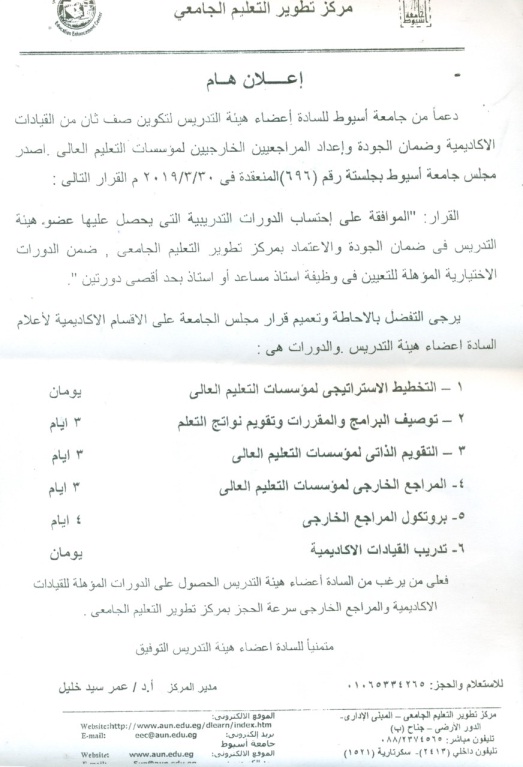 احتساب الدورات التدريبية التي يحصل عليها عضو هيئة التدريس في ضمان الجودة والاعتماد بمركز تطوير التعليم الجامعي ضمن الدورات الاختيارية المؤهلة للتعيين في وظيفة أستاذ مساعد أو أستاذ