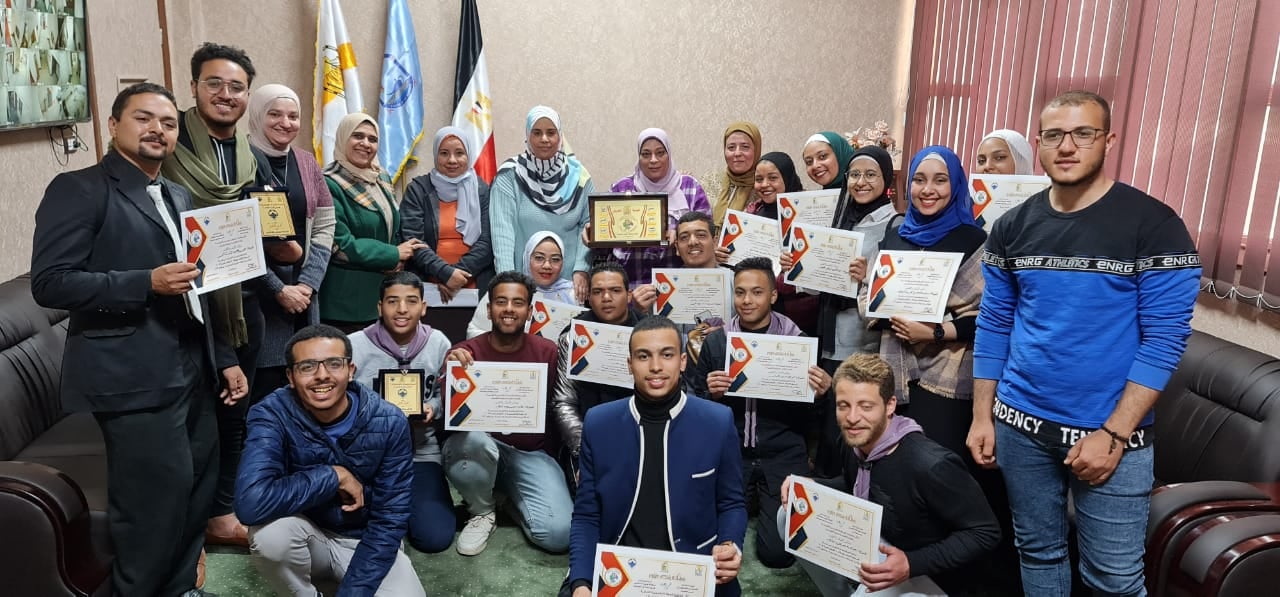 حيث قام السيد الاستاذ الدكتور/ شحاتة غريب شلقامى نائب رئيس الجامعة لشئون التعليم والطلاب بتكريم العشيرة وتسليمها الدرع وشهادات تقدير وقد حصل الطالب/ حازم على عبد العظيم على القائد المثالي على مستوى الكليات كما استقبلت الأستاذ الدكتور/ سماح محمد عبدالله عميد الكلية الطلاب الفائزين أيضا بمكتب سيادتها وقامت بتكريمهم ومنحهم جوائز مالية لدعمهم وتشجيعهم