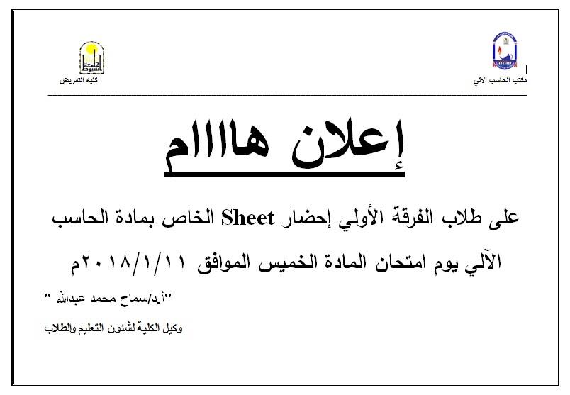 إعلاااااااااااااااان هااااااااااااااام لطلاب الفرقة الأولى "مادة الحاسب الآلي" 27 ديسمبر 2017 إعلاااااااااااااااان هااااااااااااااام لطلاب الفرقة الأولى "مادة الحاسب الآلي"
