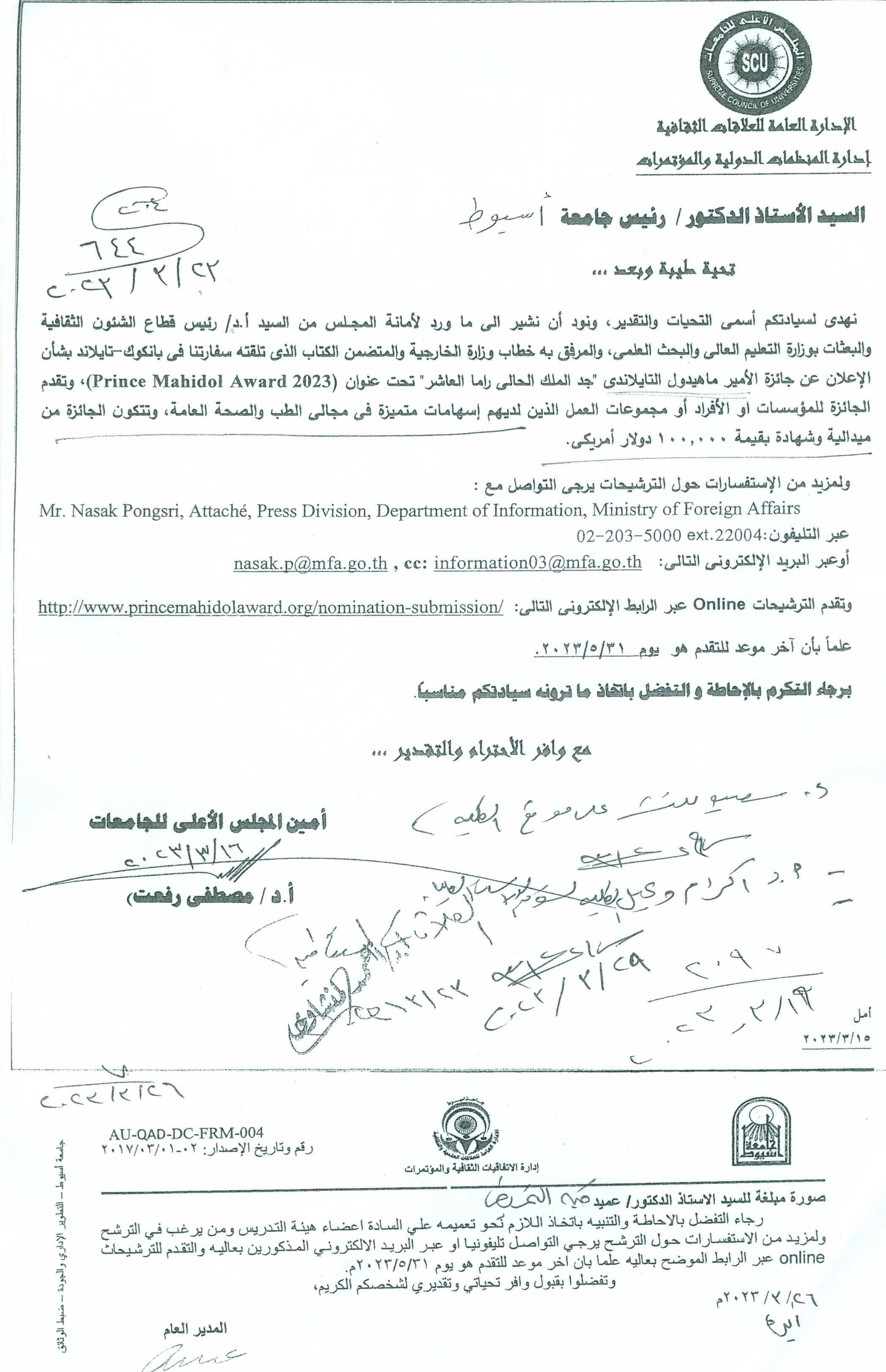 الادارة العامة للعلاقات الثقافية ادارة العلاقات الثقافية إدارة المنظمات الدولية والمؤتمرات تعلن عن جائزة الامير ما هيدول التايلاندي " جد الملك الحالي راما العاشر" تحت عنوان (prince Mahidol Award 2023)