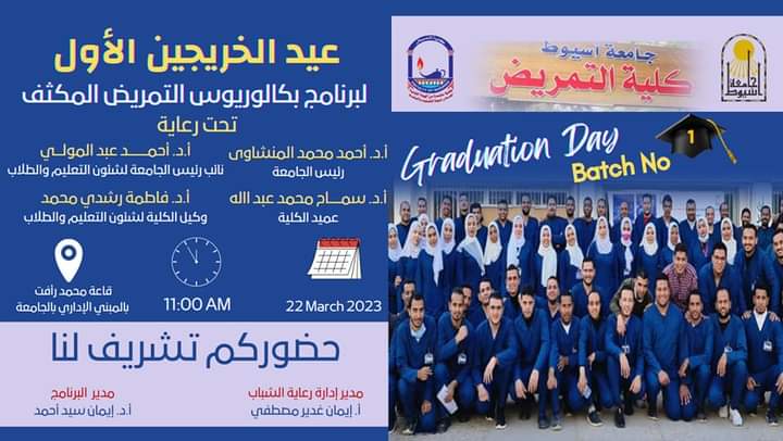 الاحتفال بتخريج الدفعة الأولى لبرنامج بكالوريوس التمريض المكثف وذلك يوم الأربعاء الموافق ٢٢مارس الحادية عشر صباحا بقاعة محمد رافت بالمبنى الادارى بالجامعة