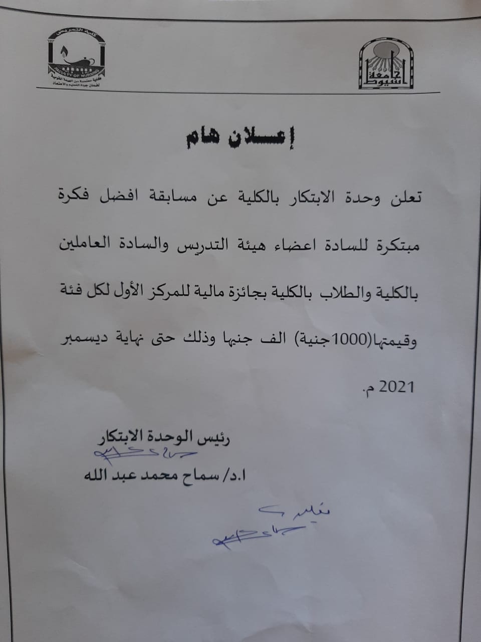 عقد مؤتمر جامعة اسيوط الدولي الخامس عشر للعلوم الصيدلية : الذكاء الاصطناعي والعلوم الصيدلية - رؤي وتحديات نحو تحقيق التنمية المستدامة وذلك يومي الاربعاء والخميس 11,12/نوفمبر 2026