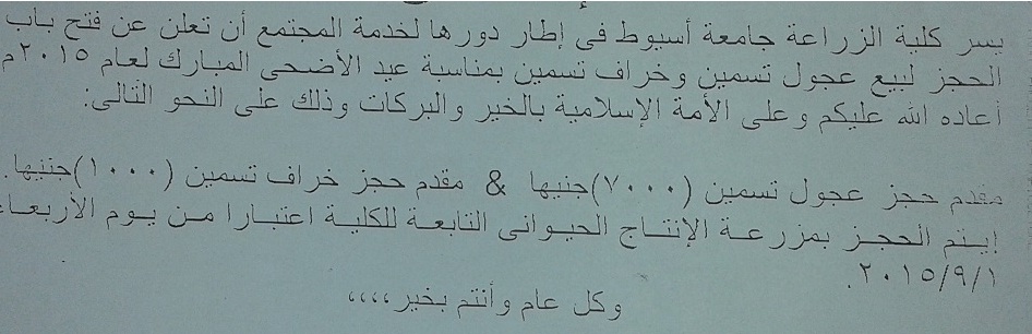 اعلان من مزرعة الإنتاج الحيواني بكلية الزراعة 31 أغسطس 2015 اعلان من مزرعة الإنتاج الحيواني بكلية الزراعة