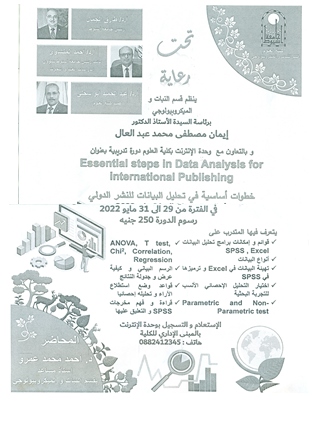 اعلان عن عقد ورشة عمل بقسم النبات والميكروبيولوجي – كلية العلوم- جامعة أسيوط في الفترة من 29 الى 31 مايو 2022م 15 مايو 2022 تحت عنوان خطوات أساسية فى تحليل البينات للنشر الدولي