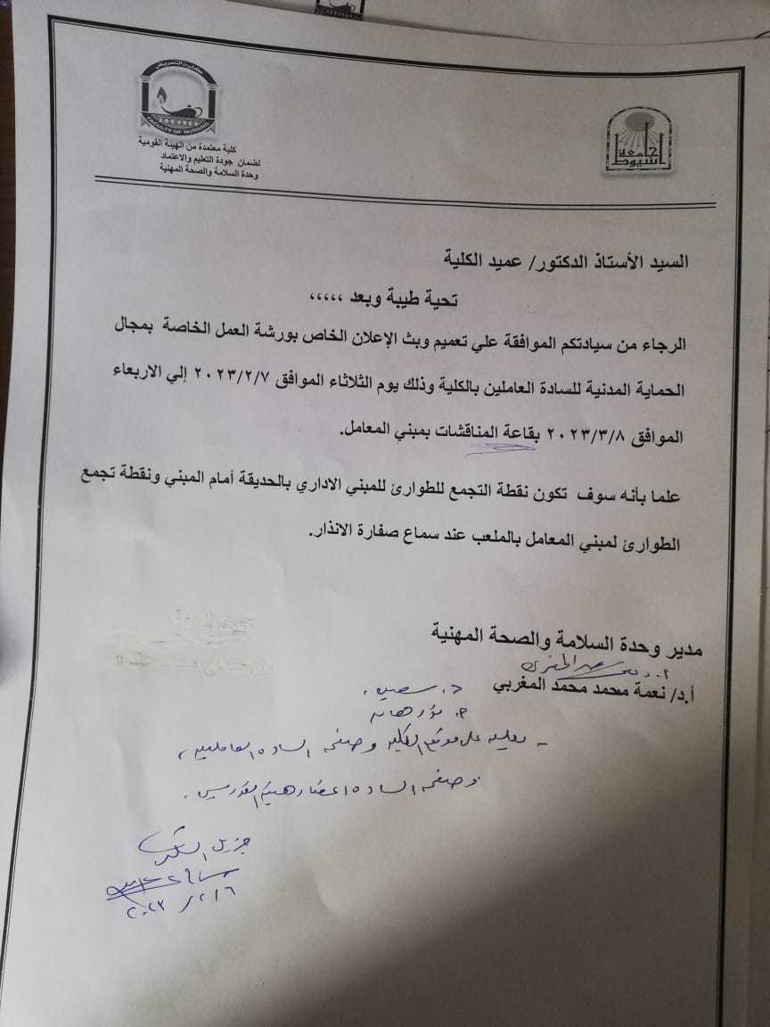 اعلان ***عقد ورشة عمل بكلية التمريض فى مجال الحماية المدنية فى الفترة من 2023/2/7 الى 2023/2/8 6 فبراير 2023