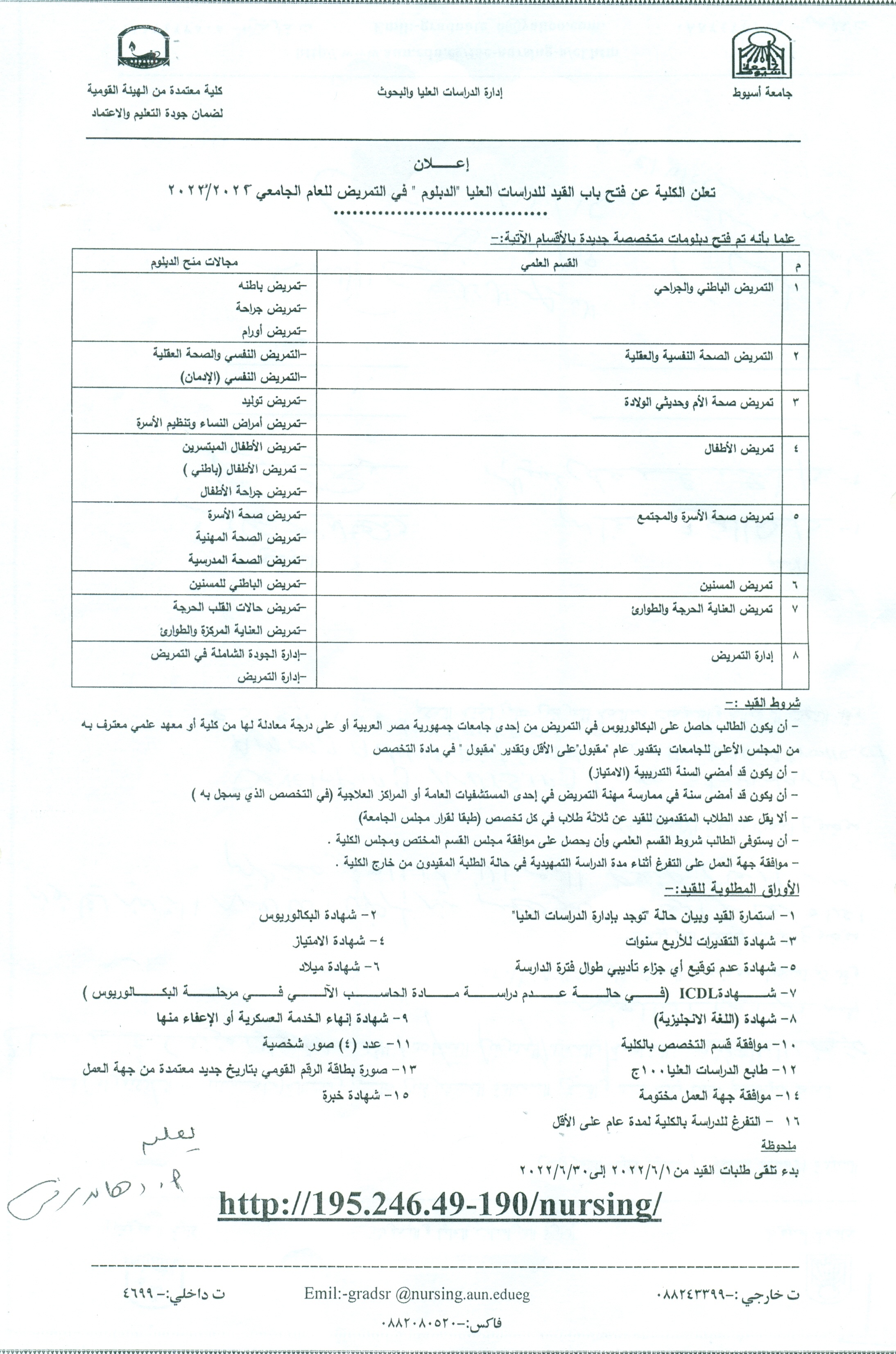 إعلان ....... تعلن الكلية عن فتح باب القيد للدراسات العليا "الدبلوم" فى التمريض للعام الجامعى 2023/2022م 29 مايو 2022