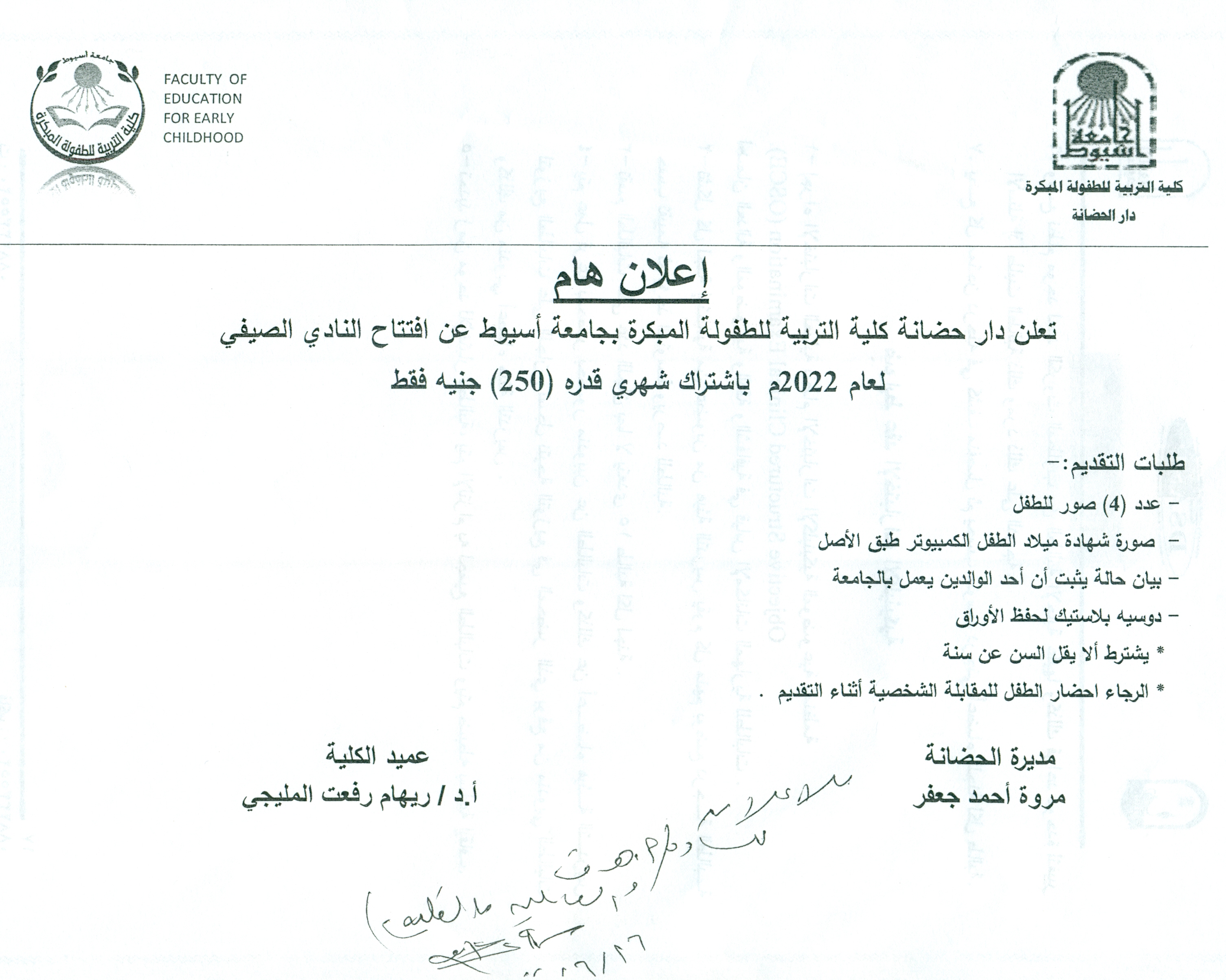 إعلان ... تعلن دار حضانة كلية التربية للطفولة المبكرة بجامعة اسيوط عن افتتاح النادى الصيفى لعام 2022م 19 يونيو 2022