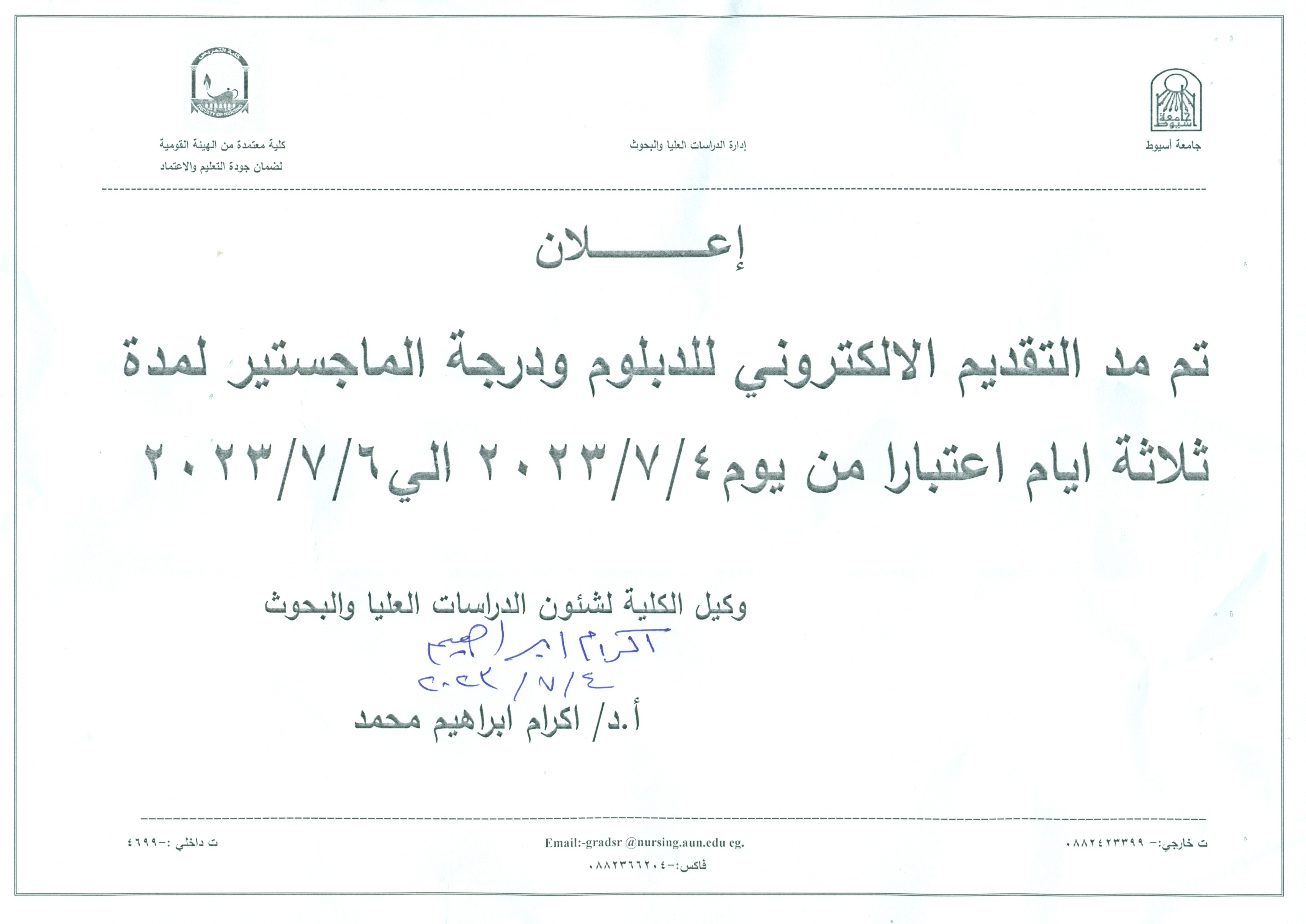 إعلان *** تم مد التقديم الالكتروني للدبلوم ودرجة الماجستير لمدة ثلاث أيام 4 يوليو 2023 من يوم 4/7/2023 إلي 6/7/2023