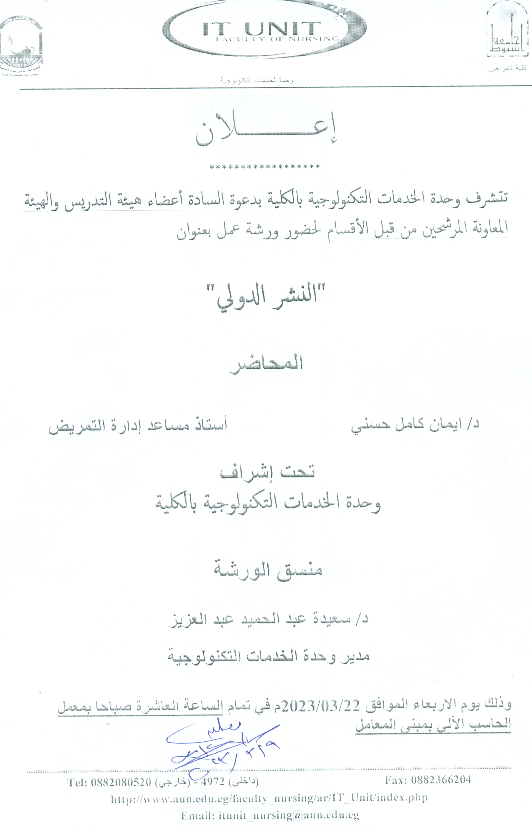 إعلان *** تتشرف وحدة الخدمات التكنولوجية بالكلية بدعوة السادة أعضاء هيئة التدريس والهيئة المعاونة المرشحين من قبل الاقسام لحضور ورشة عمل بعنوان "النشر الدولي "