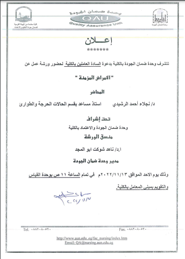 إعلان *** تتشرف وحدة ضمان الجودة بالكلية بدعوة السادة العاملين بالكلية لحضور ورشة عمل عن الامراض المزمنة يوم الاحد 2022/11/3م 7 نوفمبر 2022