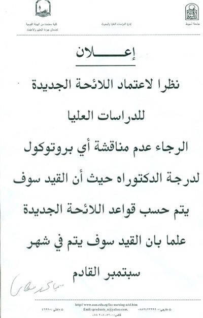 الرجاء عدم مناقشة أي بروتوكول لدرجة الدكتوراه حيث أن القيد سوف يتم حسب قواعد اللائحة الجديدة في شهر سبتمبر القادم 4 يوليو 2019 الرجاء عدم مناقشة أي بروتوكول لدرجة الدكتوراه حيث أن القيد سوف يتم حسب قواعد اللائحة الجديدة في شهر سبتمبر القادم