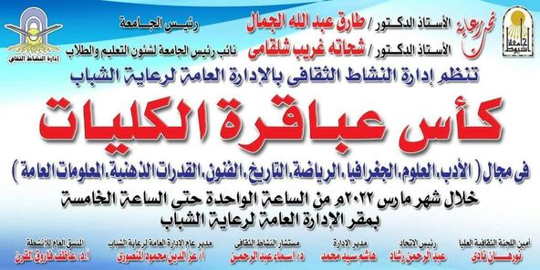 بالتهانى القلبية لفريق العباقرة بالكلية لصعود لدور الثمانية وفوز على فريق عباقرة كلية العلوم فى مسابقة كأس عباقرة الكليات التى تنظمه إدارة النشاط الثقافى بالجامعة مع تمنياتنا لهم بالتفوق في الجولة القادمة وسوف يقابل فريق عباقرة كلية التجارة خالص الامنيات لجميع ابناءنا الطلاب