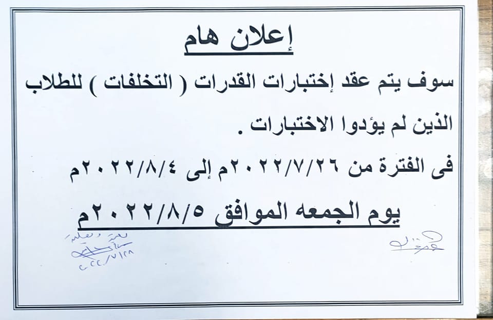 الطلاب الذين تخلفوا عن اداء اختبارات القدرات فى الموعد المحدد لهم انه سوف يتم عقد اختبار التخلفات يوم الجمعة ٢٠٢٢/٨/٥ 30 يوليو 2022