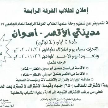 سوف يتم بمشيئة الله تعالى اجتماع لجنة شئون التعليم والطلاب برئاسة السيدة الأستاذ الدكتور / انتصار محمد يونس- وكيل الكلية لشئون التعليم والطلاب .وذلك يوم الأربعاء الموافق 8/1/2020م بكلية…