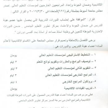 احتساب الدورات التدريبية التي يحصل عليها عضو هيئة التدريس في ضمان الجودة والاعتماد بمركز تطوير التعليم الجامعي ضمن الدورات الاختيارية المؤهلة للتعيين في وظيفة أستاذ مساعد أو أستاذ