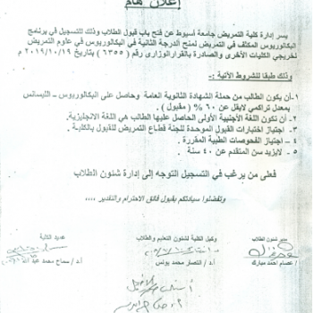 سوف يتم بمشيئة الله تعالى اجتماع لجنة المختبرات والمعامل برئاسة السيدة الأستاذ الدكتور/ شلبية السيد أبو زيد - وكيل الكلية لشئون البيئة وتنمية المجتمع وذلك يوم الأحد الموافق…