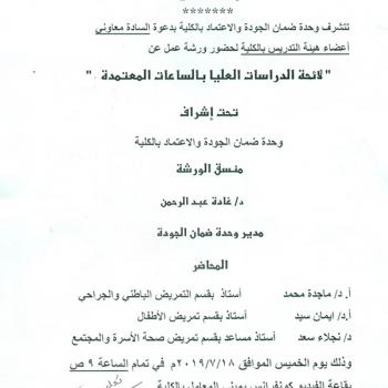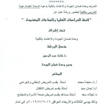 سوف يتم بمشيئة الله تعالى اجتماع لجنة الدراسات العليا برئاسة السيدة الأستاذ الدكتور/ ميمي محمد مكاوي - وكيل الكلية للدراسات العليا والبحوث. وذلك يوم الأربعاء الموافق 10/7/2019م بكلية…