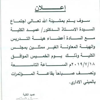 سوف يتم بمشيئة الله تعالى اجتماع لجنة أخلاقيات المهنة برئاسة السيدة الأستاذ الدكتور/ مرزوقة عبد العزيز جاد الله - وذلك يوم الأربعاء الموافق 10/7/2019م في تمام الساعة الحادية عشر ظهراً بكلية…