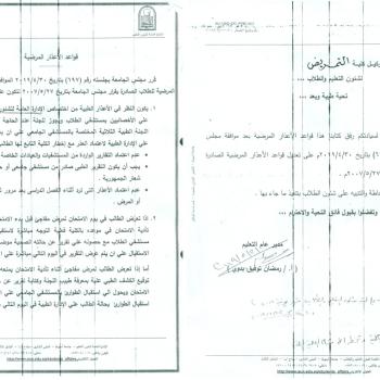 قواعد الأعذار المرضية للطلاب بعد موافقة مجلس الجامعة بجلسته رقم (697) بتاريخ 30/4/2019م على تعديل قواعد الأعذار المرضية الصادرة بقرار مجلس الجامعة في 27/5/2007م