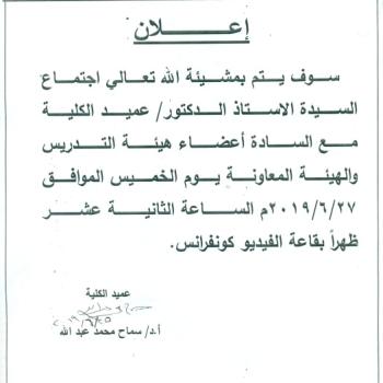 سوف يتم بمشيئة الله تعالى اجتماع مجلس قسم تمريض النساء والتوليد برئاسة السيدة الأستاذ الدكتور/ مرفت علي خميس رئيس قسم تمريض النساء والتوليد وبحضور السادة أعضاء هيئة التدريس…