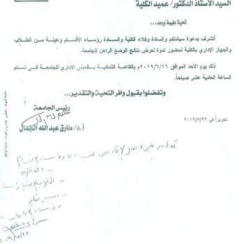 سوف يتم بمشيئة الله تعالى اجتماع مجلس الكلية لشهر يونيو يوم الخميس الموافق 20/6/2019م في تمام الساعة العاشرة صباحاً بقاعة مجلس الكلية بمبنى المعامل بكلية التمريض - جامعة أسيوط