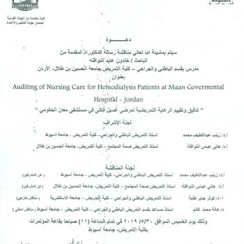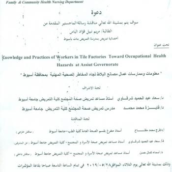 سوف يتم بمشيئة الله تعالى مناقشة بروتوكول رسالة الماجستير الخاص بالباحثة / الزهراء عبد المنعم مصطفى معيد بقسم تمريض المسنين-كلية التمريض-جامعة جنوب الوادي