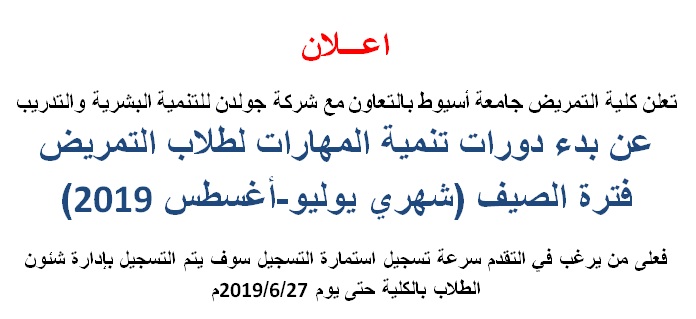 بدء دورات تنمية المهارات لطلاب التمريض فترة الصيف (شهري يوليو - أغسطس 2019م) 13 يونيو 2019 ملف PDF لإعلان الدورة الصيفية التدريبية بجامعة سيبريا