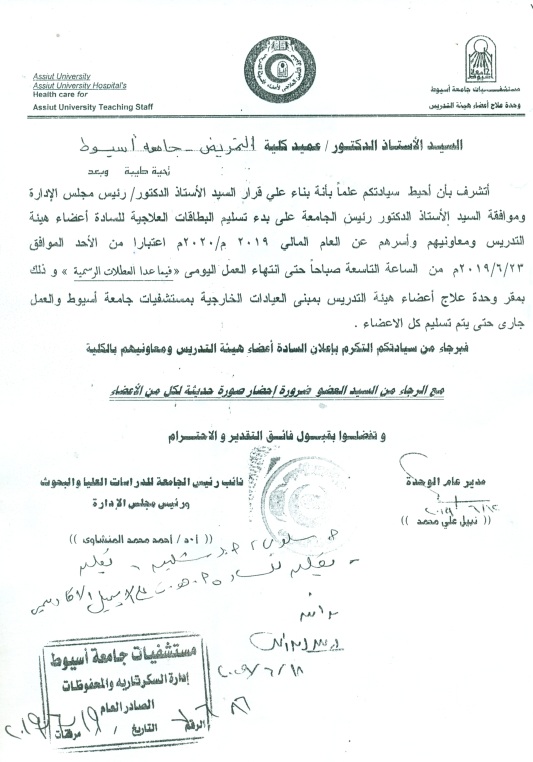 بدء تسليم البطاقات العلاجية للسادة أعضاء هيئة التدريس ومعاونيهم وأسرهم عن العام المالي 2019/2020م 1 يوليو 2019 بدء تسليم البطاقات العلاجية للسادة أعضاء هيئة التدريس ومعاونيهم وأسرهم عن العام المالي 2019/2020م