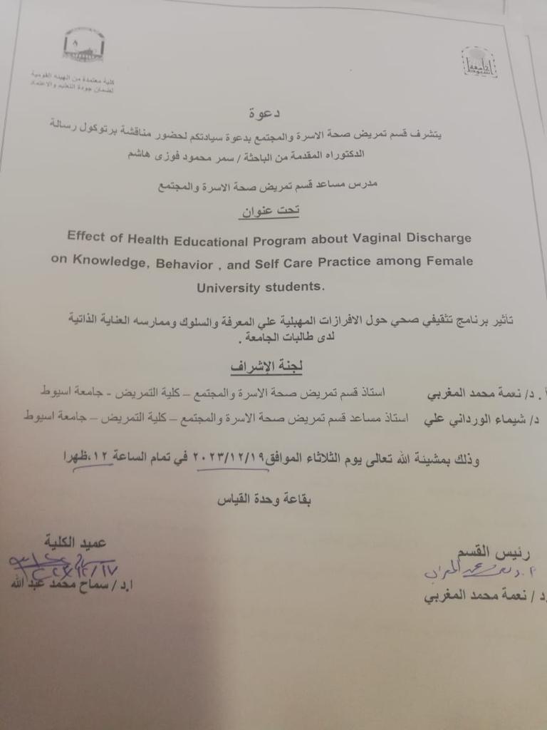 حضور مناقشة برتوكول رسالة الماجستير المقدمة من الباحثة / سمر محمود فوزي هاشم