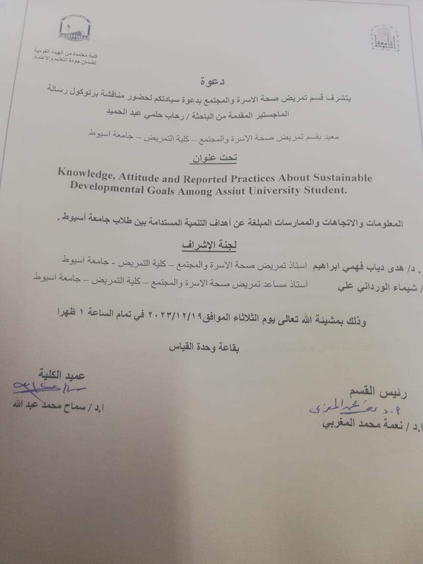 حضور مناقشة برتوكول رسالة الماجستير المقدمة من الباحثة / رحاب حلمي عبد الحميد