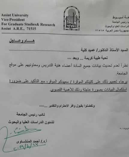 ضرورة استكمال وتحديث بيانات أعضاء هيئة التدريس ومعاونيهم على الموقع الإلكتروني للجامعة 8 مايو 2019 ضرورة استكمال وتحديث بيانات أعضاء هيئة التدريس ومعاونيهم على الموقع الإلكتروني للجامعة