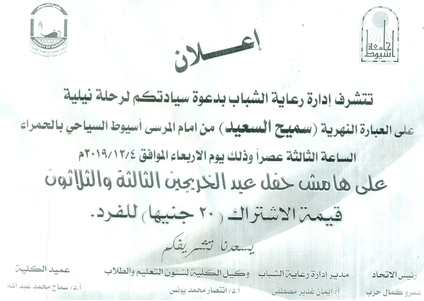 دعوة إدارة رعاية الشباب لرحلة نيلية على العبارة النهرية (سميح السعيد) على هامش حفل عيد الخريجين 4 ديسمبر 2019 دعوة إدارة رعاية الشباب لرحلة نيلية على العبارة النهرية (سميح السعيد) على هامش حفل عيد الخريجين