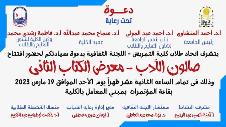 دعوة لجميع أبناءنا الطلاب المهتمين بفنون الادب والثقافة لحضور افتتاح صالون الأدب ومعرض الكتاب الثانى بحضور كوكبة من المثقفين والشعراء .بقاعة المؤتمرات بمبنى المعامل الساعة الثانية عشر ظهرا