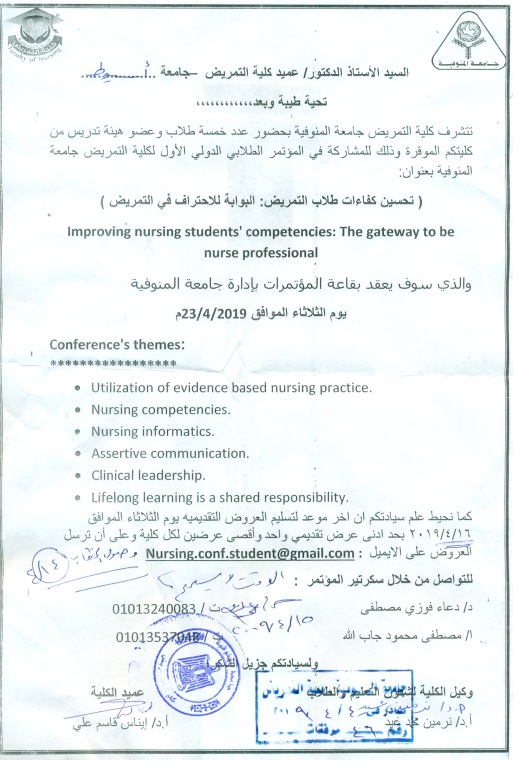 دعوة للمشاركة في المؤتمر الطلابي الدولي الأول لكلية التمريض بجامعة المنوفية 15 أبريل 2019 دعوة للمشاركة في المؤتمر الطلابي الدولي الأول لكلية التمريض بجامعة المنوفية