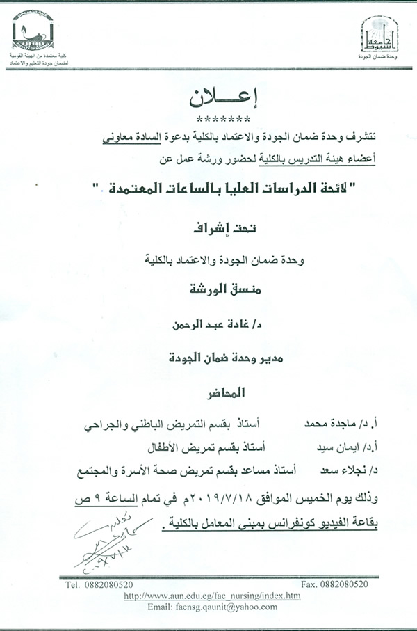 دعوة للسادة معاوني أعضاء هيئة التدريس لحضور ورشة عمل عن "لائحة الدراسات العليا بالساعات المعتمدة" 15 يوليو 2019 دعوة للسادة معاوني أعضاء هيئة التدريس لحضور ورشة عمل عن "لائحة الدراسات العليا بالساعات المعتمدة"