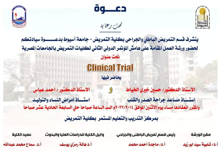 دعوة (ورشة العمل لقسم التمريض الباطنى والجراحى بكلية التمريض) 12 فبراير 2022 يتشرف قسم التمريض الباطنى والجراحى بكلية التمريض جامعة أسيوط بدعوة سيادتكم لحضور ورشة العمل المقامة على هامش المؤتمر الدولى الثانى لكليات التمريض بالجامعات المصرية