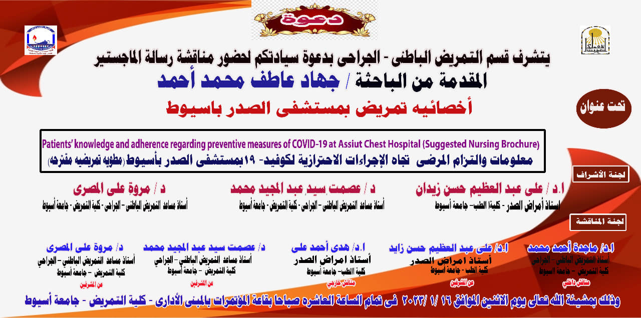 حصول رسالة الماجستير الخاصة بالباحثة/ جهاد عاطف محمد اخصائي تمريض بمستشفى الصدر بأسيوط على تقدير امتياز