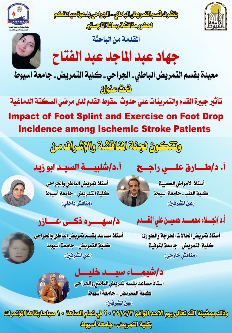أ.د/ شلبية السيد أبو زيد أستاذ تمريض الباطني والجراحي كلية التمريض -جامعة أسيوط (مناقش داخلي)