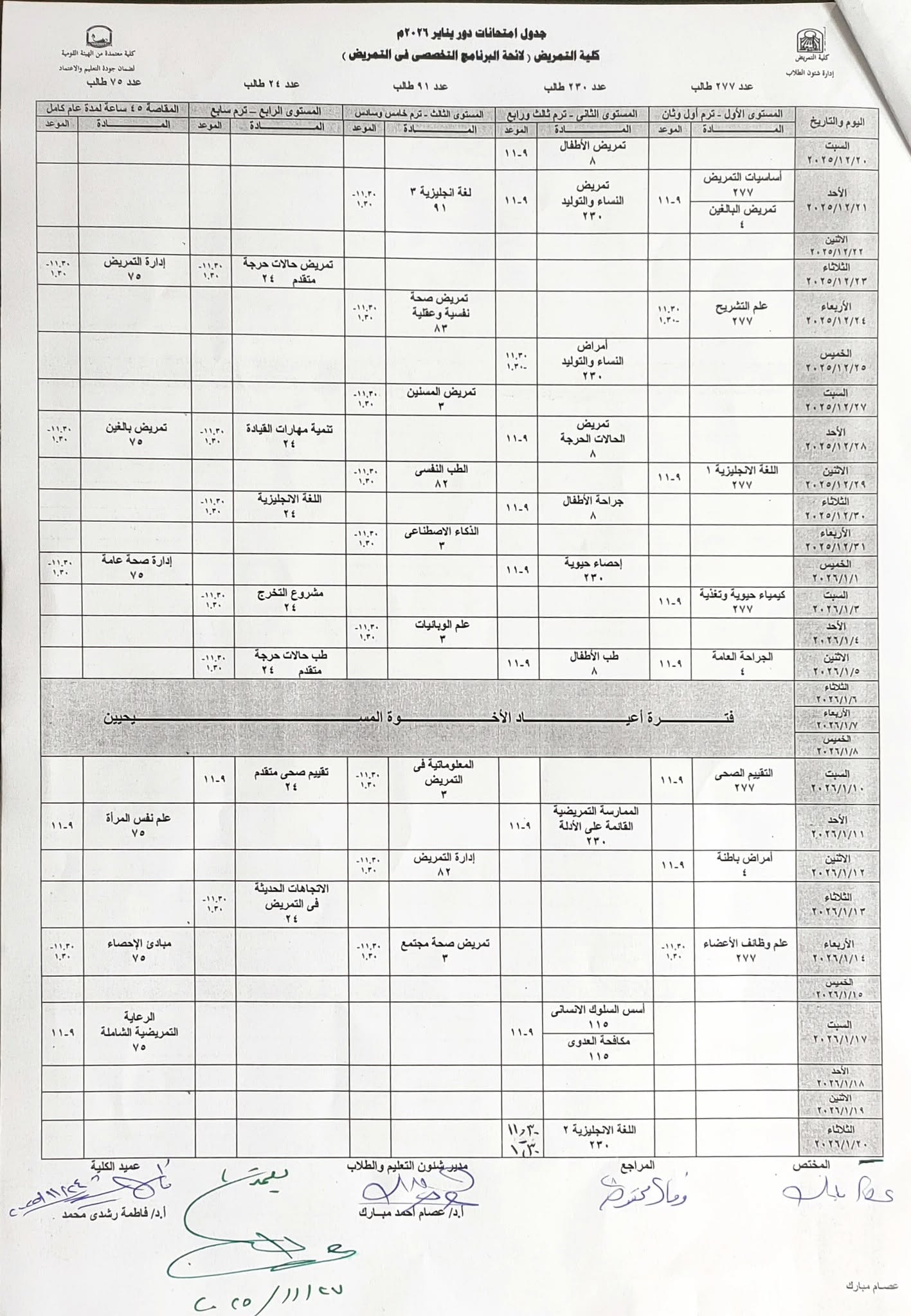 جداول امتحانات دور يناير ٢٠٢٦/٢٠٢٥م كلية التمريض - جامعة أسيوط مع تمنياتنا للجميع بالتوفيق والنجاح.. 6 ديسمبر 2025