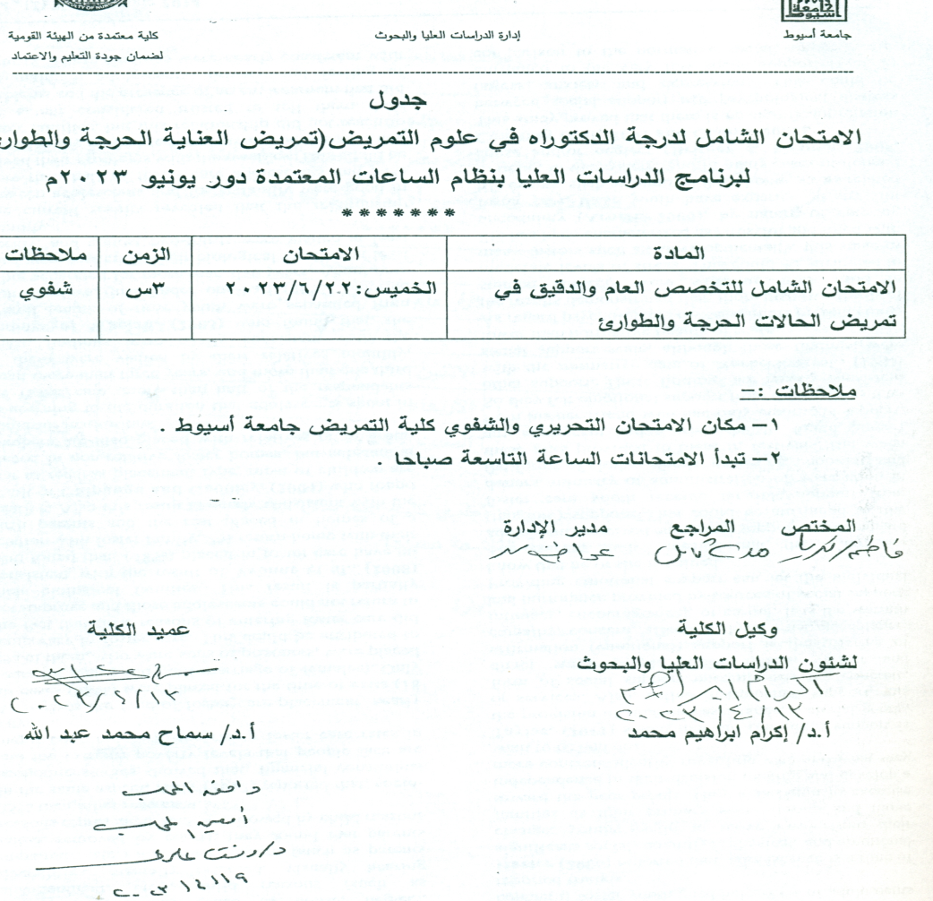 جدول الامتحان الشامل لدرجة الدكتوراه في علوم التمريض (تمريض العناية الحرجة والطوارئ) لبرنامج الدراسات العليا بنظام الساعات المعتمدة دور يونيو 2023م 31 مايو 2023