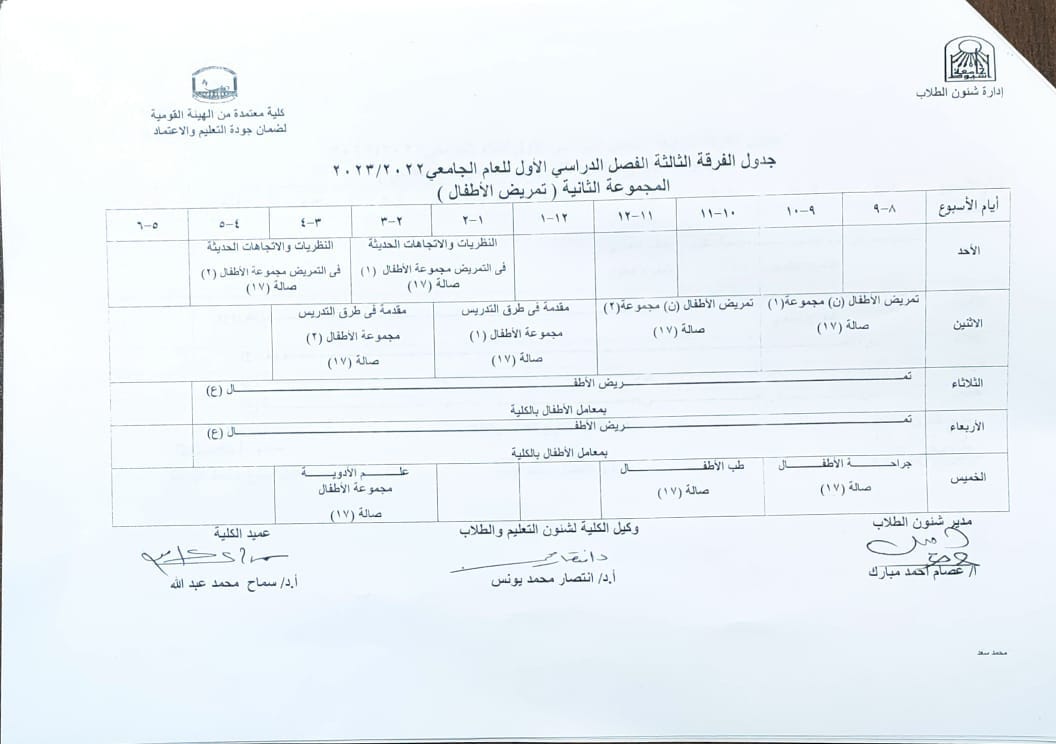 جدول الفرقة الثالثة الفصل الدراسي الأول للعام الجامعي 2022-2023م المجموعة الثانية(تمريض الأطفال) 26 سبتمبر 2022