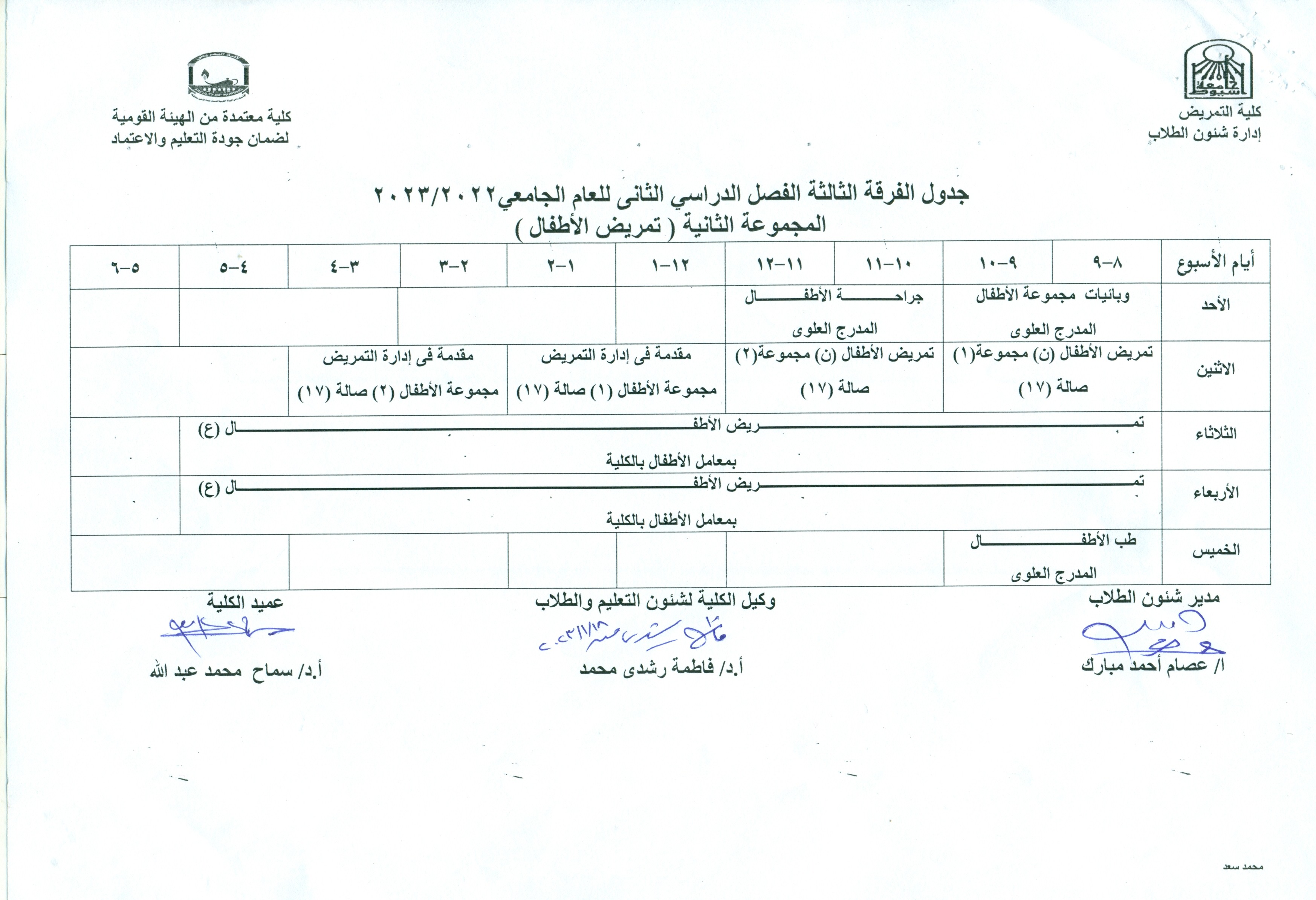 جدول الفرقة الثالثة- المجموعة الثانية (تمريض الأطفال) الفصل الدراسي الثاني للعام الجامعي 2022-2023م 6 فبراير 2023