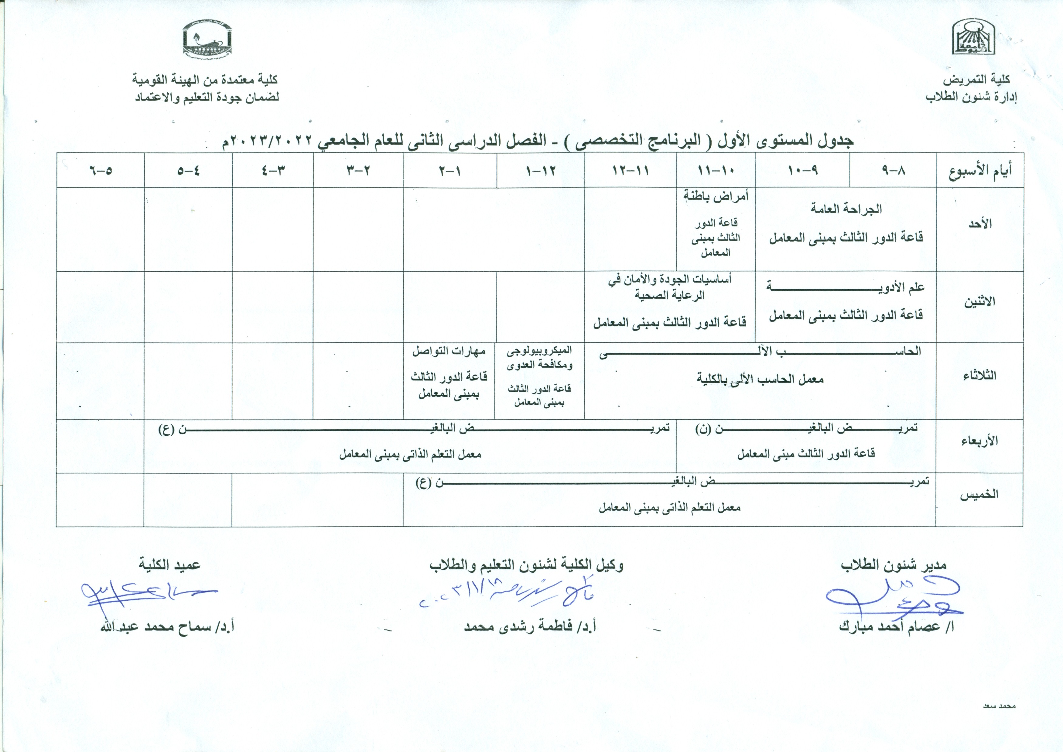جدول المستوي الاول (البرنامج التخصصي) الفصل الدراسي الثاني للعام الجامعي 2022-2023م