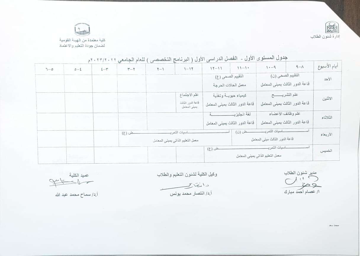 جدول المستوى الأول – الفصل الدراسي الأول (البرنامج التخصصي) للعام الجامعي 2023/2022م